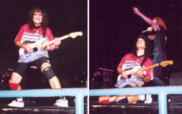 I like playing the "Energetic" songs rather than the "Control" songs live because they're a lot easier and I can run around on-stage and goof off more. On the Control songs, we have to watch what we're doing. If the monitors are really bad, we could get lost. The songs on Energetic are almost all 4/4 with simple power chords. I don't mind at all playing the songs that Billy wrote. I also copy the storylines of some of his solos. As a matter of fact, all of the songs that we played at the last Tower shows are all Billy/Doug songs. We really wanted to play "Mayday in Kiev" but Jason had never sang it, and I didn't want him to be concerned with learning and remembering lyrics that he was unfamiliar with. On the "Control And Resistance" tour, we played everything off of the album except "Lifecycles" because that's more of a studio song. I remember on the "Control" tour always being glued to my pedalboard switching presets for different harmonies with my foot while playing solos. On "Mayday" I used to hit the footswitch 15 times during the solo. Then on the "Energetic" songs I could be falling on the floor, on the drum platform or wherever I wanted to be.