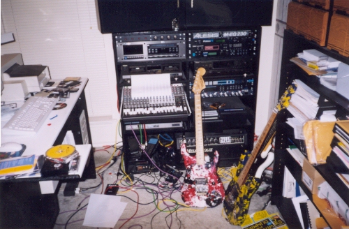 It's going great, but taking too damn long. I've been working on this CD for over 2 years now, and it's a bitch trying to pull everything together. Bobby and I set up my recording gear back in his rehearsal place and ran everything into my Mackie mixer and ADAT. I then took the tracks home and transferred them into my computer. I'm right in the middle of recording all of my guitar parts over here at my home ADAT studio. I had to cancel a few WatchTower rehearsals to get going on it. Sunday is my only day off, and I'm trying to get moving on these recordings. Steve (DiGiorgio) got an ADAT tape sent to him a few weeks ago. Sean's got a computer hard drive studio setup at this place and he's already recording. The songs on "Ink Compatible" are much heavier than those on "Ink Complete", and have countless measures of 15/16, 7/8, 11/16, etc.... I've been comparing guitar sounds and listening to what would work best for the songs, and I matched up Dimebag's sound on the "Southern Trendkill" album. Really heavy and crunchy. I know that a few fans are expecting the music to be somewhat watered down, because there will be vocals on most of the tracks, but that's not going to happen. And I'm pretty happy with the drum sounds that we're getting too. When Bobby and I recorded "Ink Complete", we thought we were going to have to record everything in a real studio, so we didn't totally knock ourselves out trying to get studio quality out of a 4 track. We never did rerecord the "Ink Complete" songs because time and money got in the way, so I just did the best that I could with what I had. I've got some studio quality gear now, and I'm doing everything I can to make it sound top notch. When we recorded the drums a few months ago, Bobby and I went back and forth between live acoustic sounds and samples, and got the best possible sounds. On "Ink Complete" we had something like 3 mikes all running into one channel on a 4 track! I'm doing a lot of transferring files from ADAT to computer and back and forth, so I'm getting some really clean recordings.